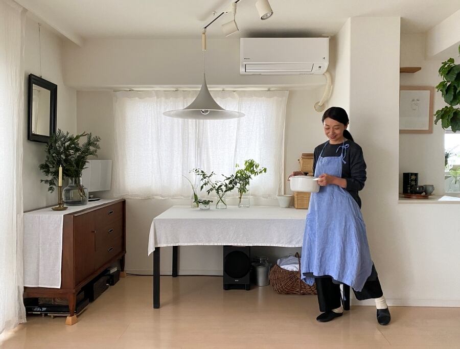 ウォッシャブルウールが使われたジャージーワンピースは家で手軽に水洗いできるので料理をするときも安心です。濃い色合いのチャコールグレーは杢のニュアンスが素敵。明るいブルーのエプロンと合わせて色で春を取り入れてみました。ボトムスにはイージーパンツを履いて活動的に。家時間もお気に入りがあるとルーティンのように活躍するので朝何を着るか迷わなくていいですね。(板倉さん)